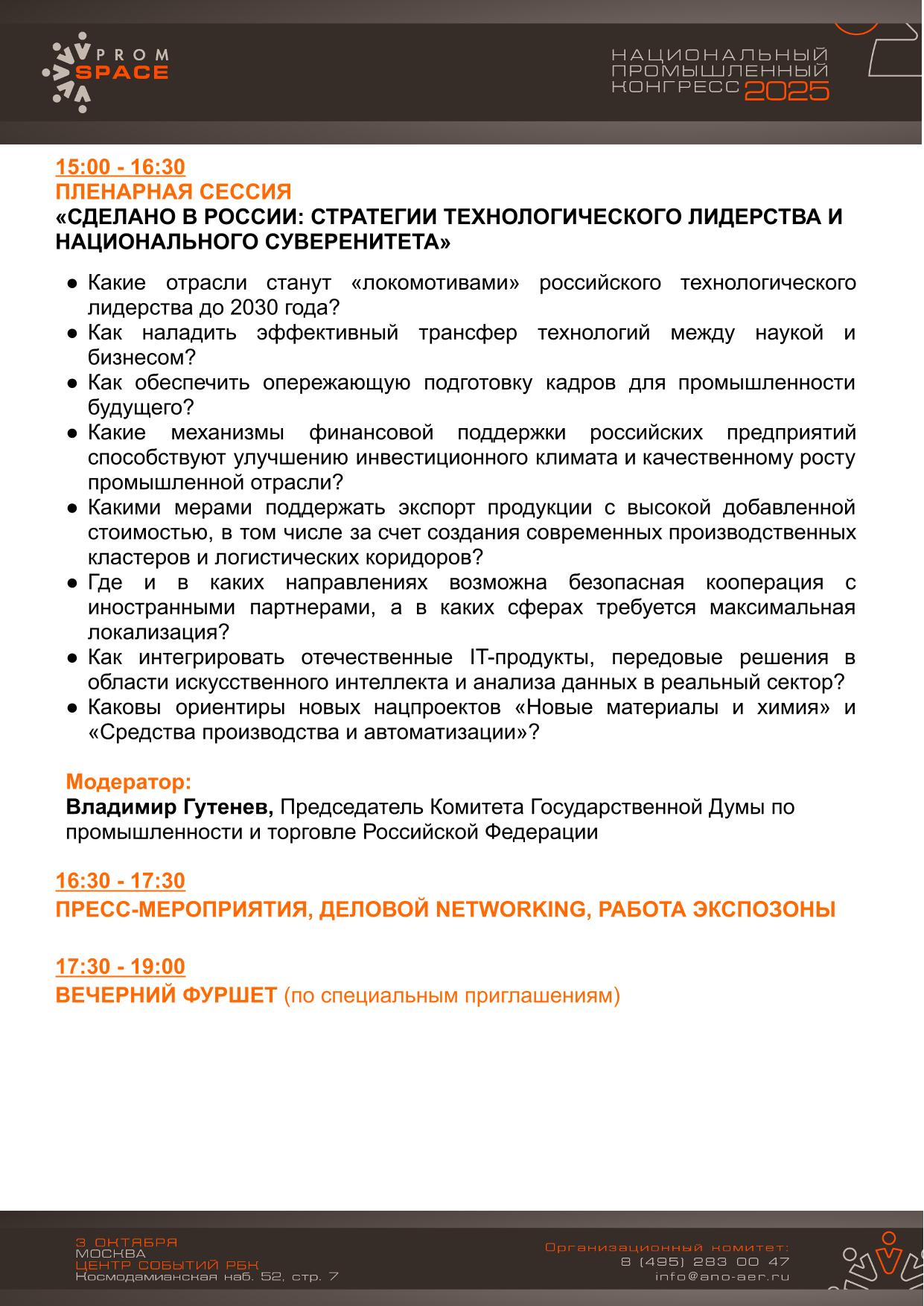 Национальный промышленный Конгресс «PromSpace» – открытая дискуссионная площадка, посвященная вопросам формирования актуальной промышленной повестки в России, поддержке отечественных производителей и повышению их конкурентоспособности.Главная тема Конгресса в 2025 году – «Сделано в России: стратегии технологического лидерства и национального суверенитета»