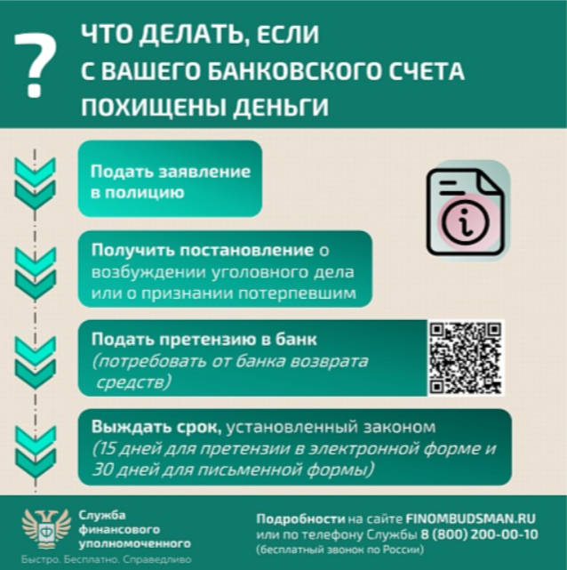 Если с Вашего банковского счета похищены деньги, а банк отказывается их вернуть, необходимо обратиться к финансовому уполномоченному, который бесплатно и в короткие сроки рассмотрит Ваше обращение.