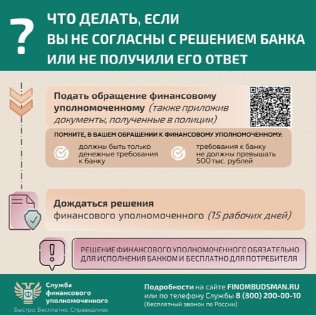 5. если Вы не согласны с решением банка: Подать обращение финансовому уполномоченному (в том числе приложив документы, полученные в полиции);