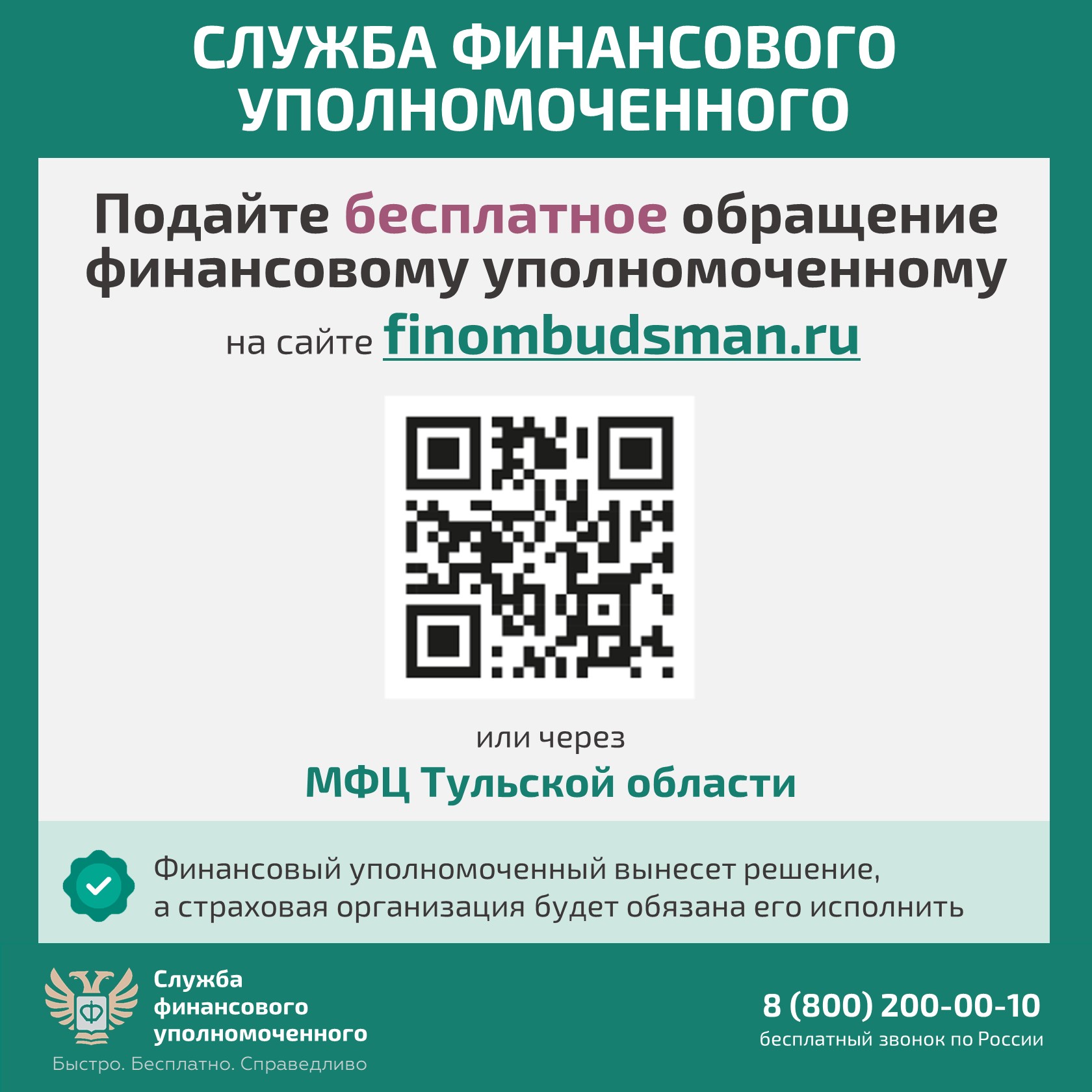 Направить обращение финансовому уполномоченному можно через личный кабинет на сайте finombudsman.ru или через МФЦ Тульской области.