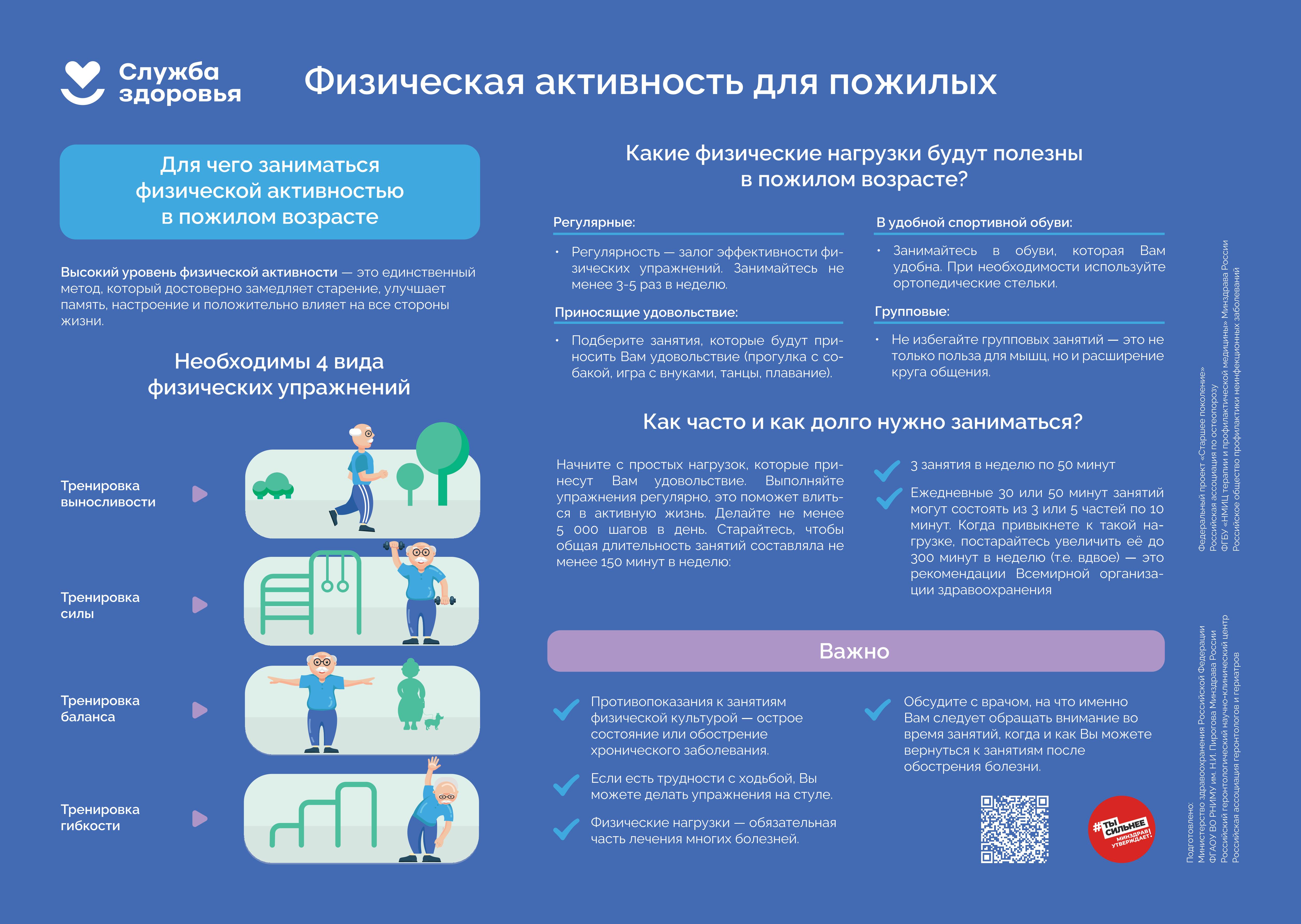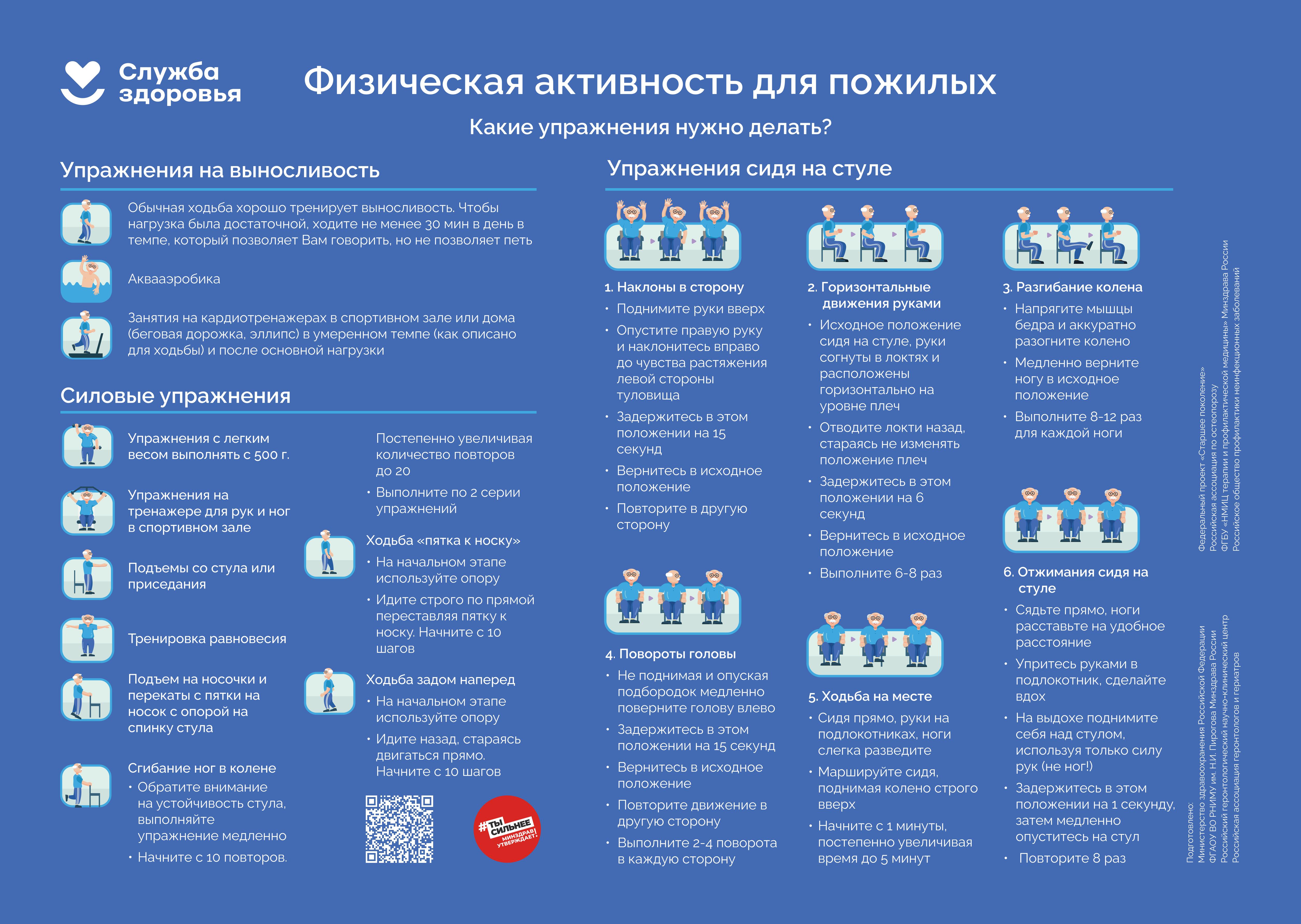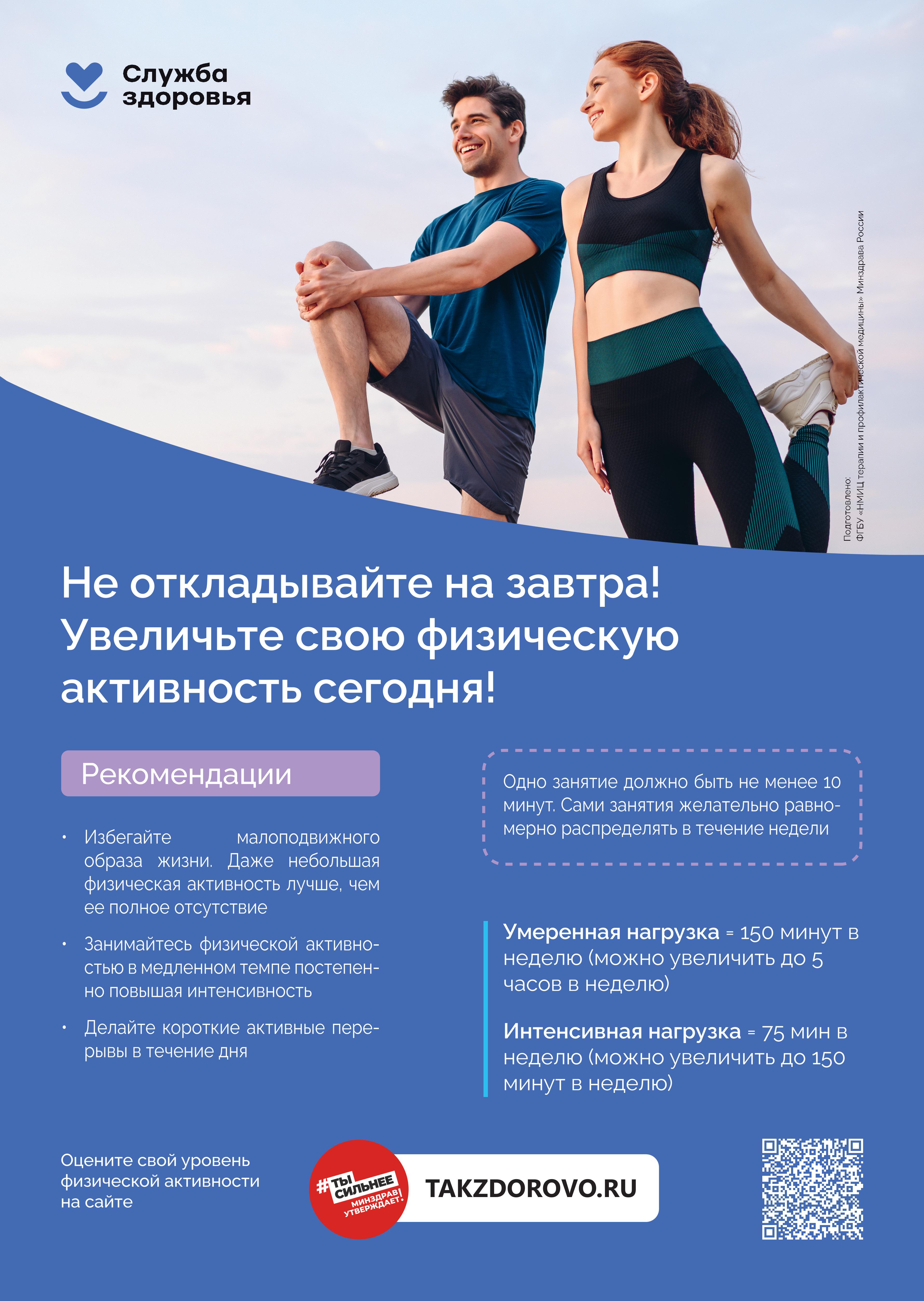 1. Минимум 150–300 минут умеренной физической активности или минимум 75–150 минут интенсивной физической активности или эквивалентной комбинации в течение недели;