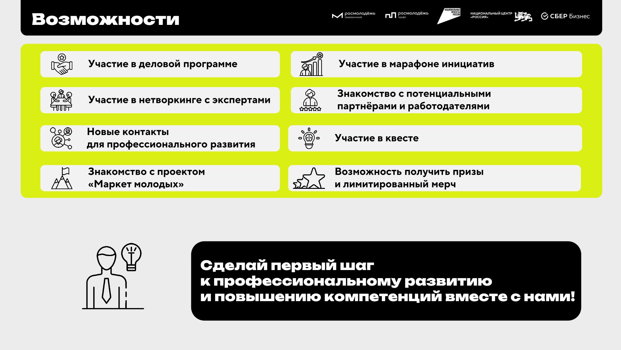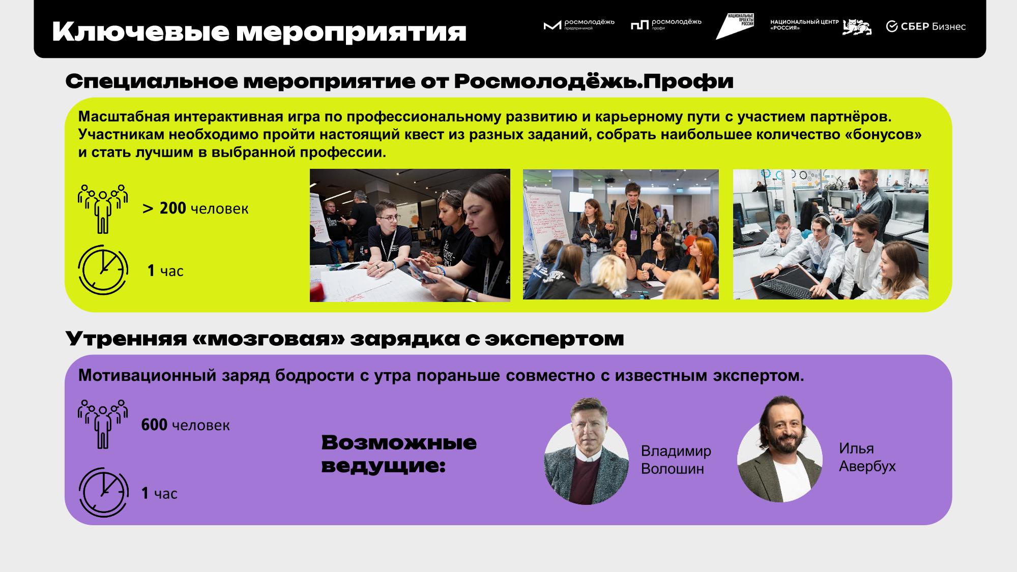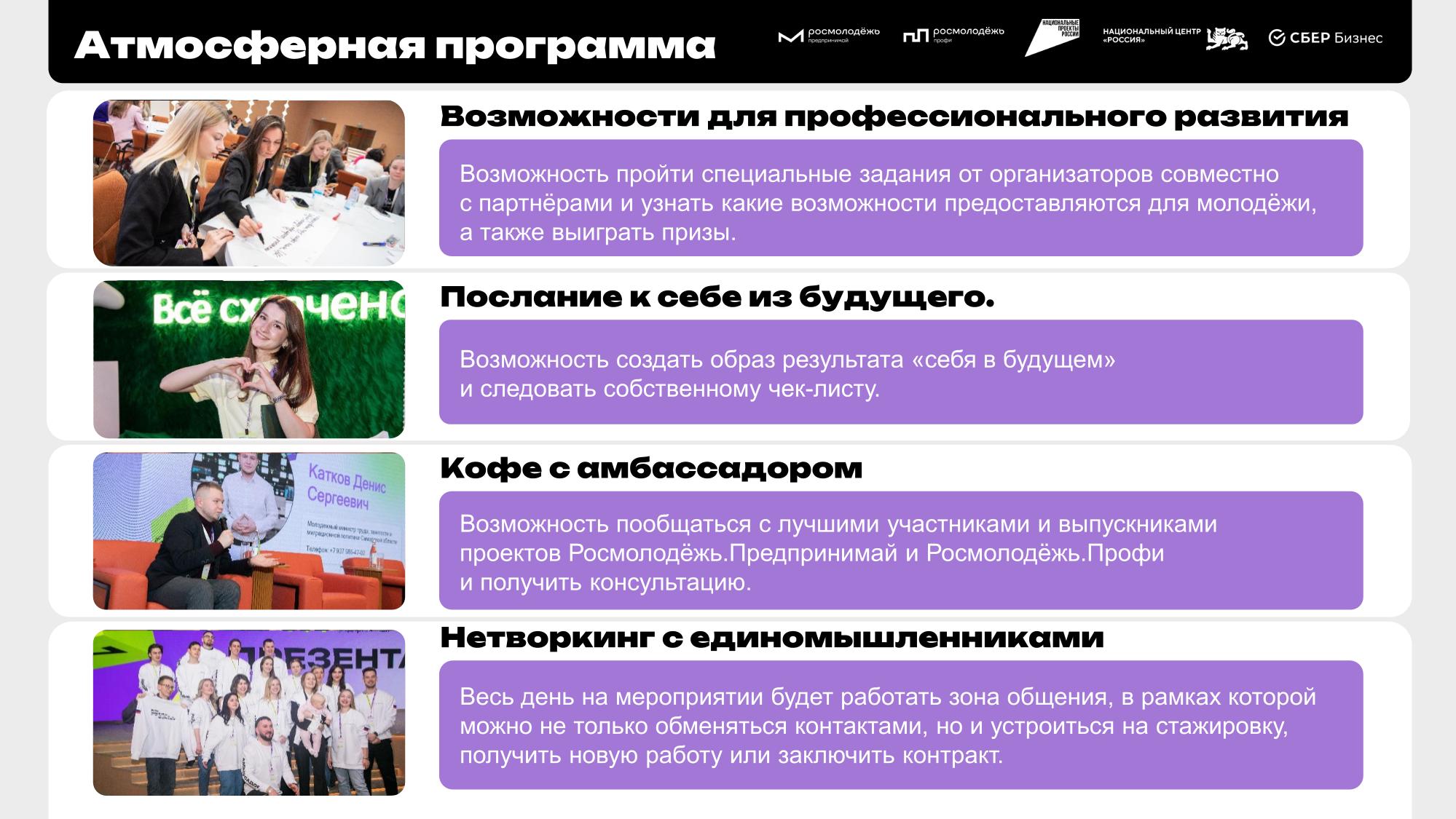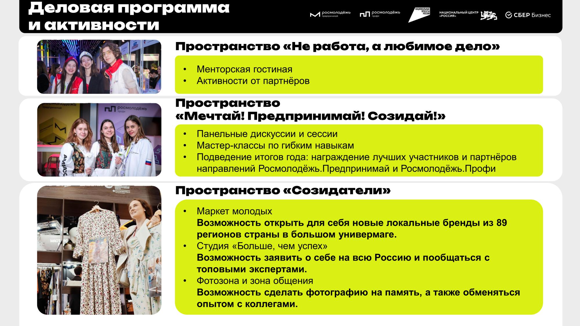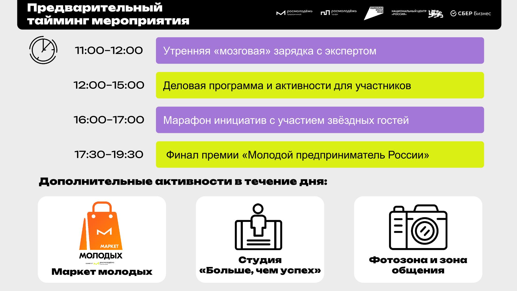 В рамках мероприятия запланирована насыщенная деловая программа, включая разноформатные активности и мастер-классы для молодежи, а также пройдет церемония награждения победителей Всероссийской премии «Молодой предприниматель России».