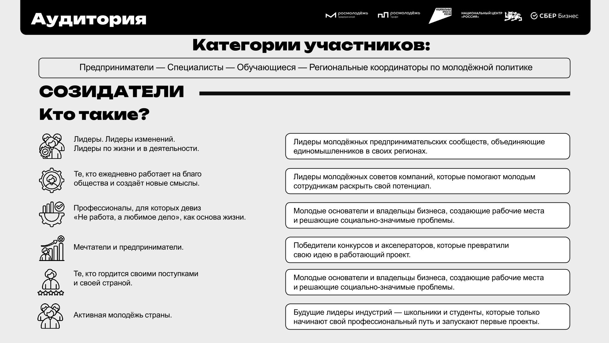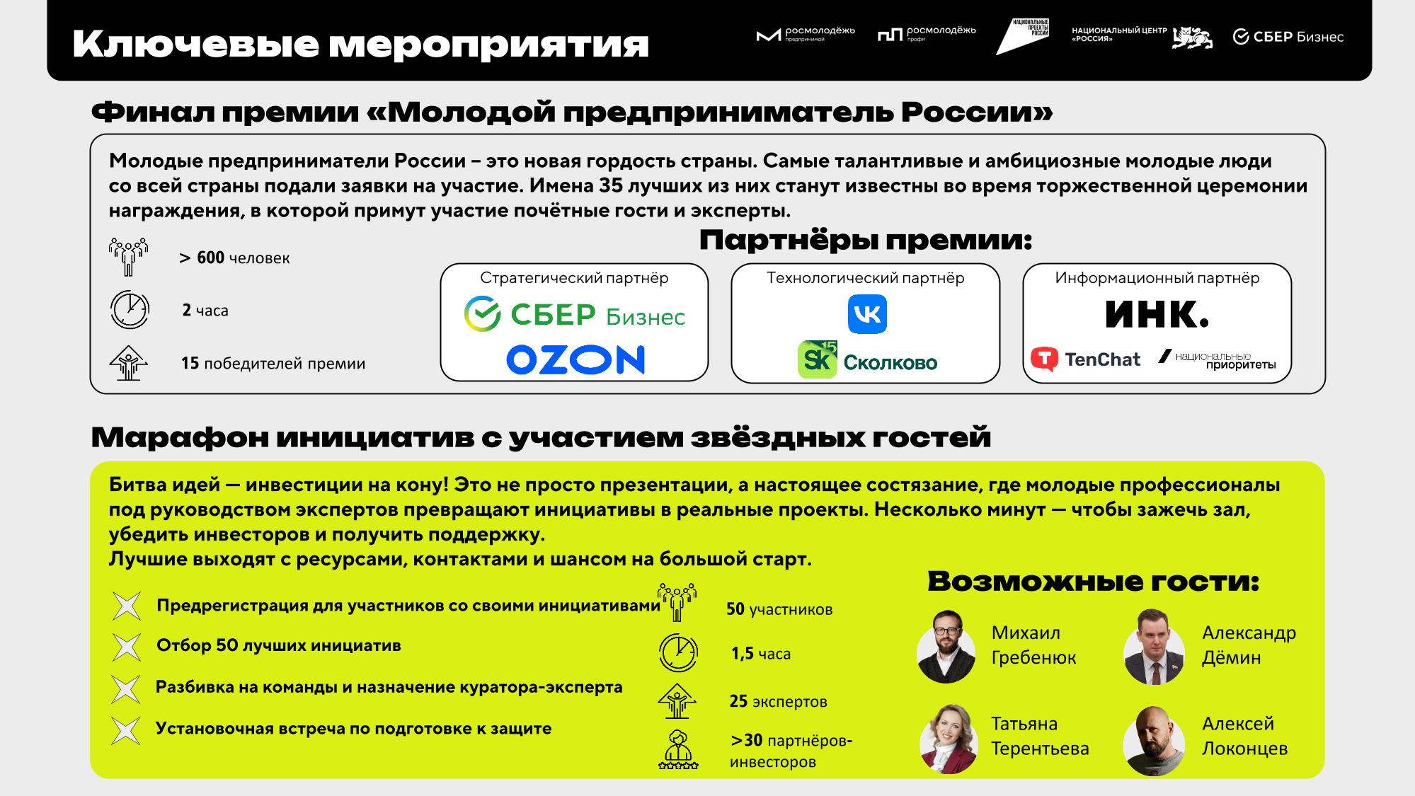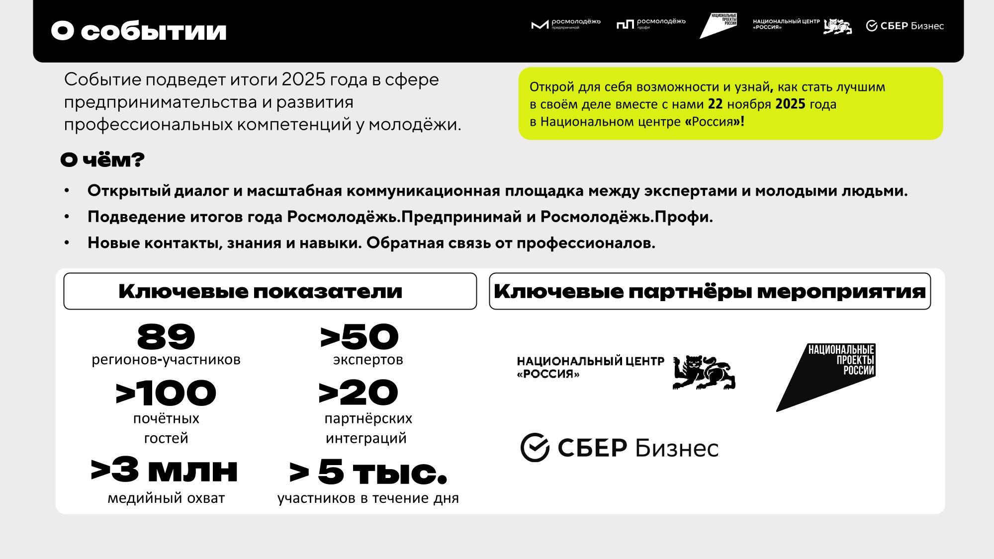 Для подведения итогов Всероссийской программы по развитию молодежного предпринимательства в 2025 году запланировано проведение масштабного мероприятия «Созидатели. Итоги года Росмолодежь.Предпринимай и Росмолодежь.Профи».